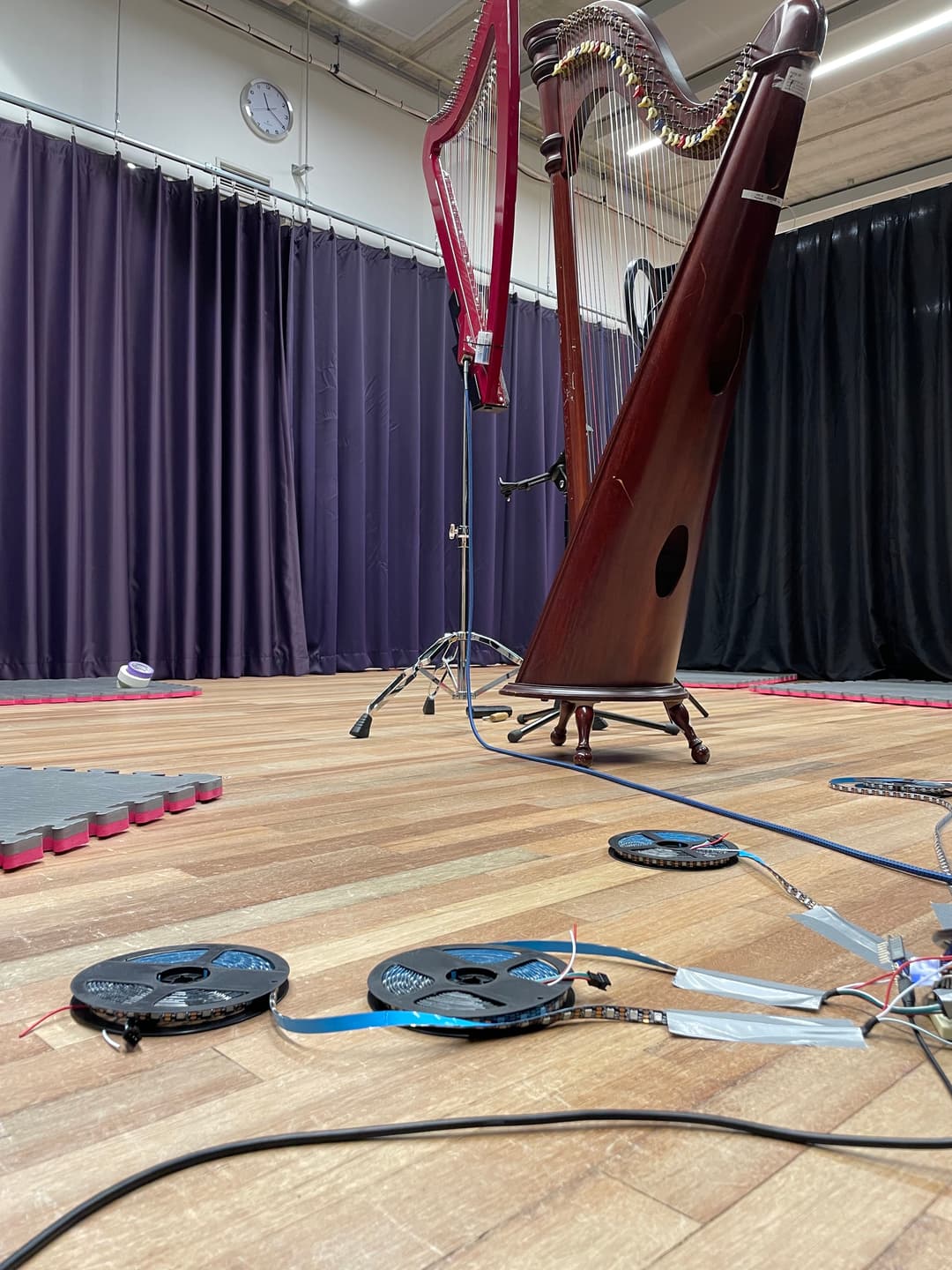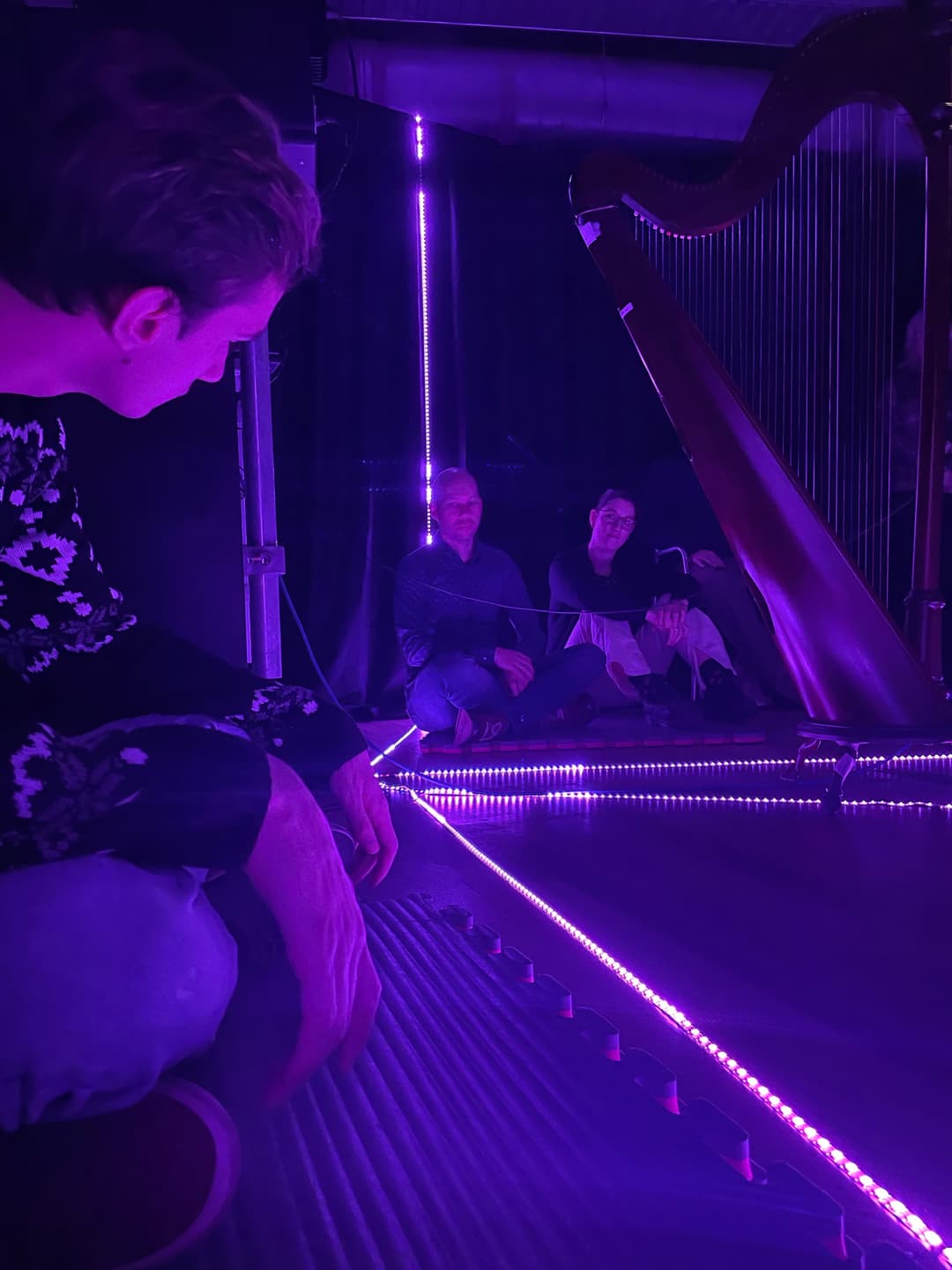 Het eerste stuk was Canon in D van Pachabel, dat naadloos overvloeide in het tweede stuk Purple Rain van Prince. Van klassiek naar pop dus. Rowan en David hadden de LED-strips geprogrammeerd, zodat die reageerden op de muziek van de harp. Bij het klassieke stuk was de sfeer daardoor heel anders dan bij Purple Rain.