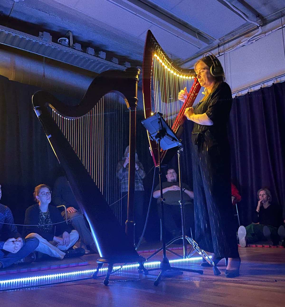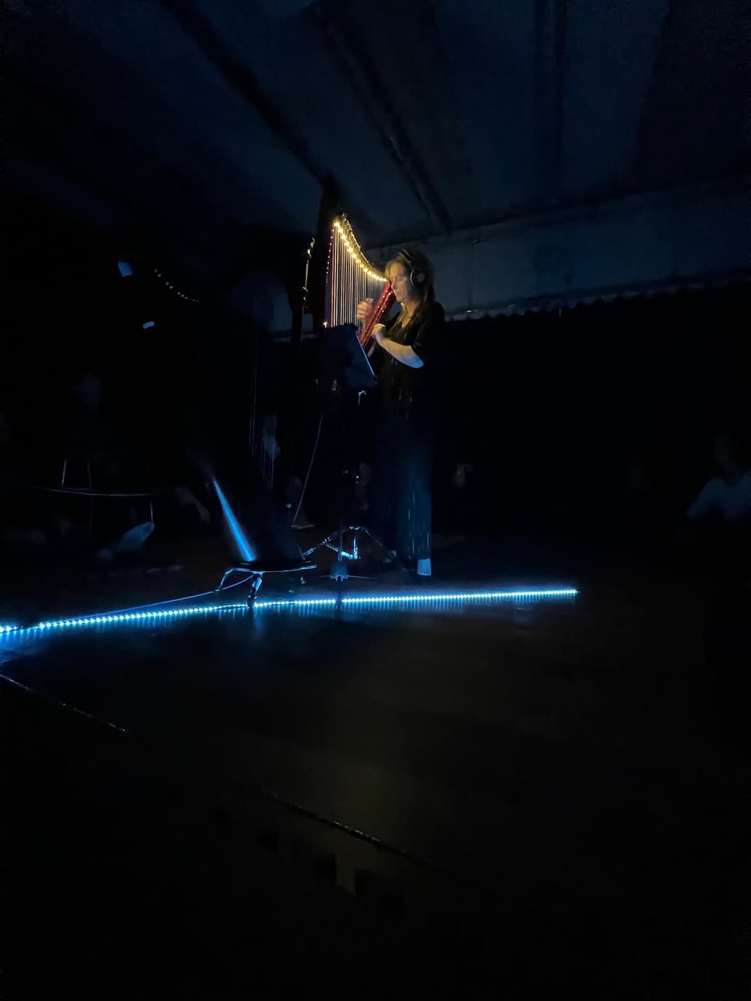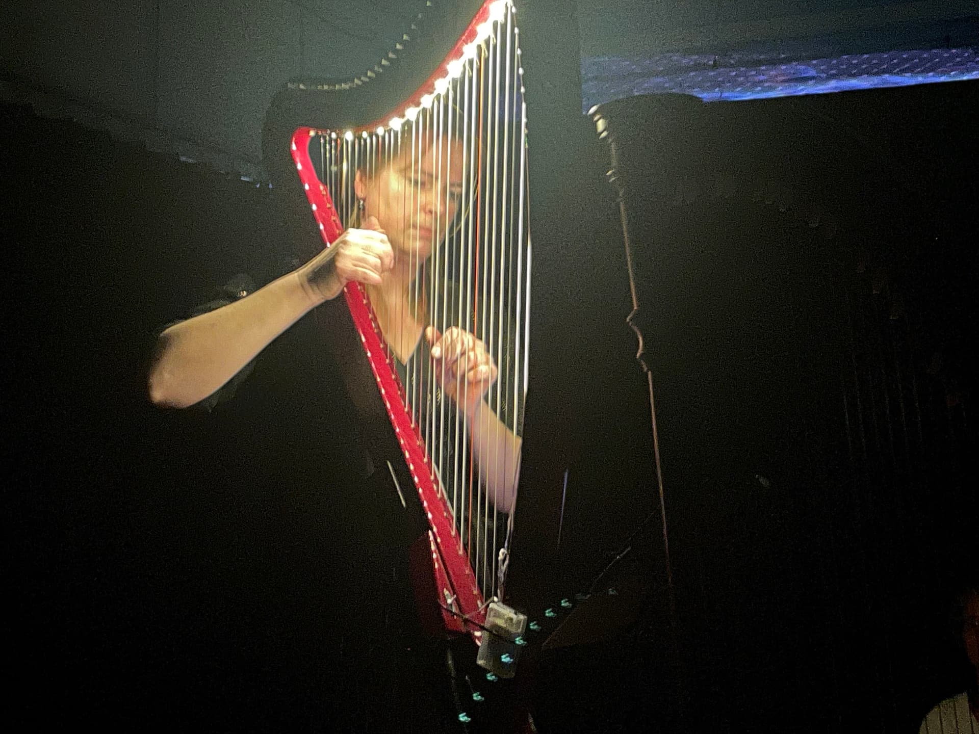 De elektrische harp van Marjatta had in dit stuk een grote rol. Jordy zat achter de knoppen en kon de gespeelde stukken van Marjatta live loopen en naast elkaar afspelen.