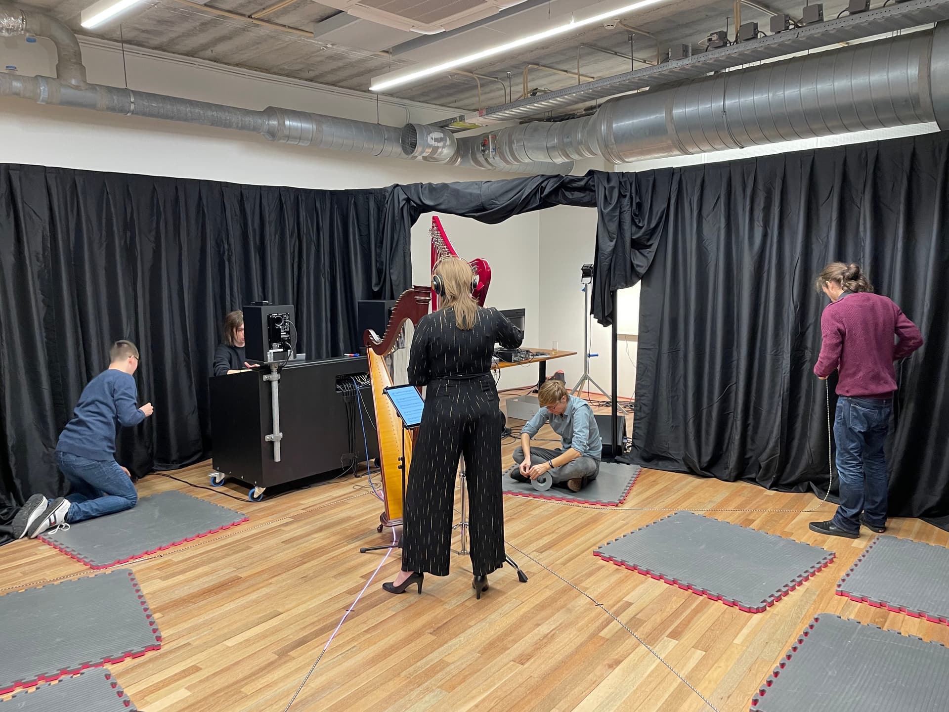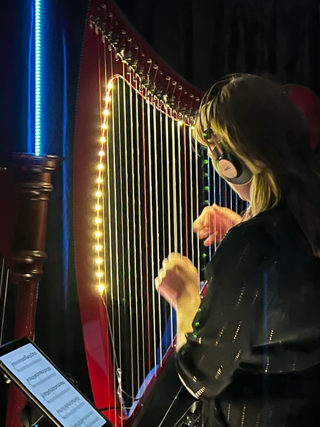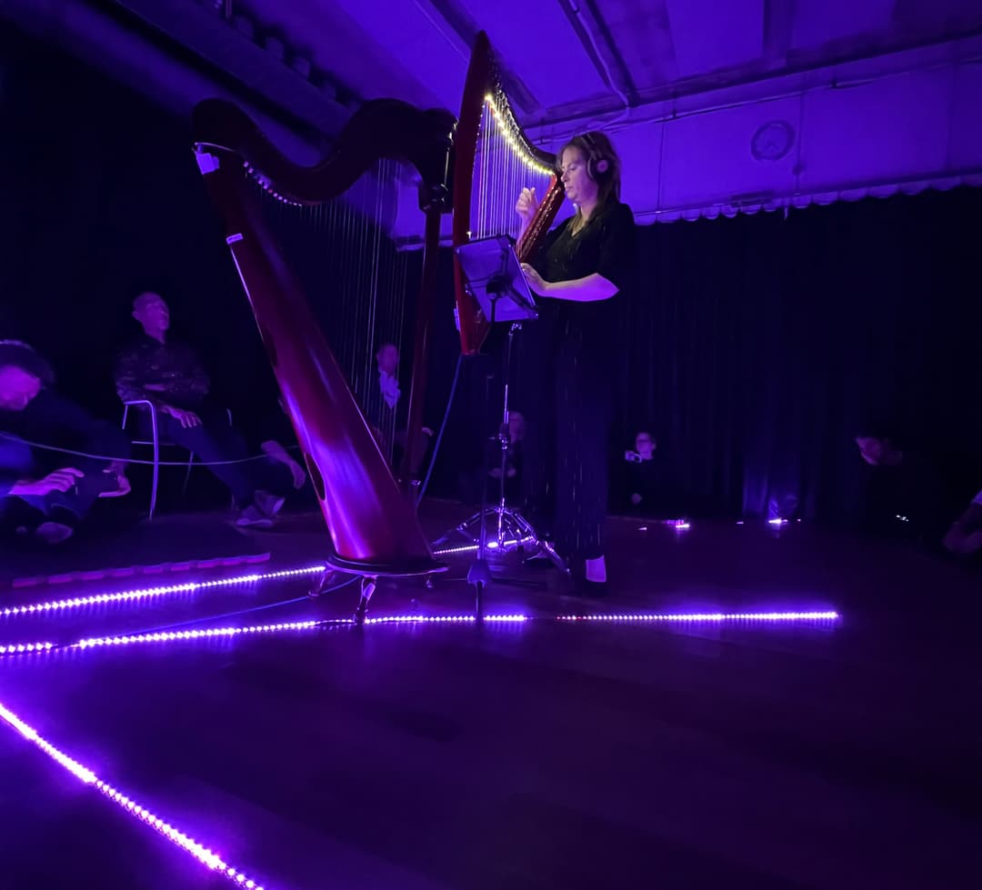 De elektrische harp van Marjatta had in dit stuk een grote rol. Jordy zat achter de knoppen en kon de gespeelde stukken van Marjatta live loopen en naast elkaar afspelen.